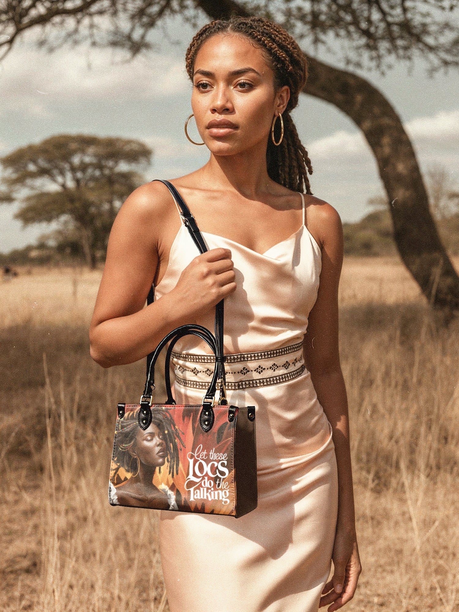 Front and center, she stands regal—eyes closed, spirit open, locs cascading in defiance and grace. The message? “Let these LOCS do the talking.” And trust—when you walk in with this beauty on your arm, everyone listens.