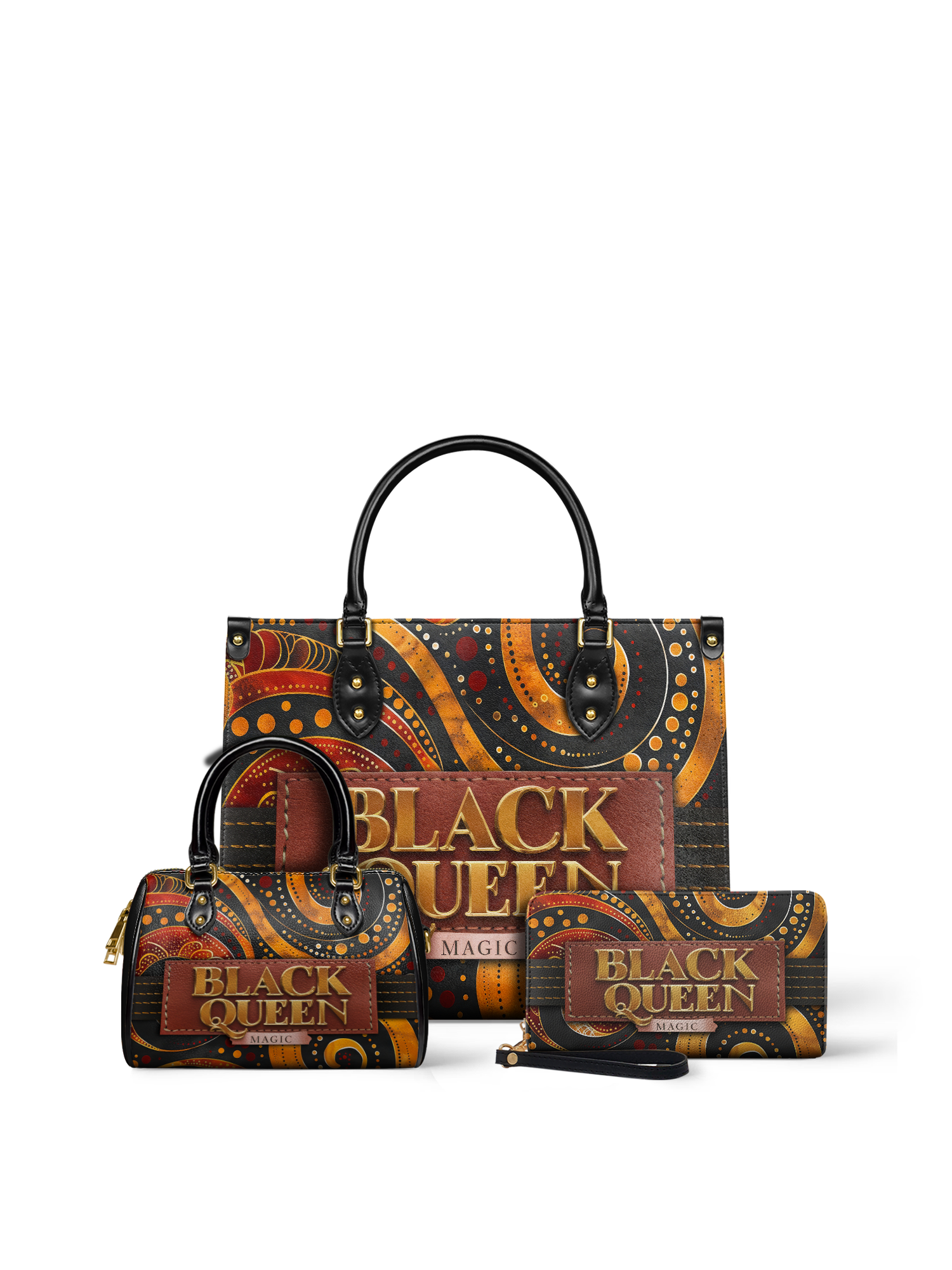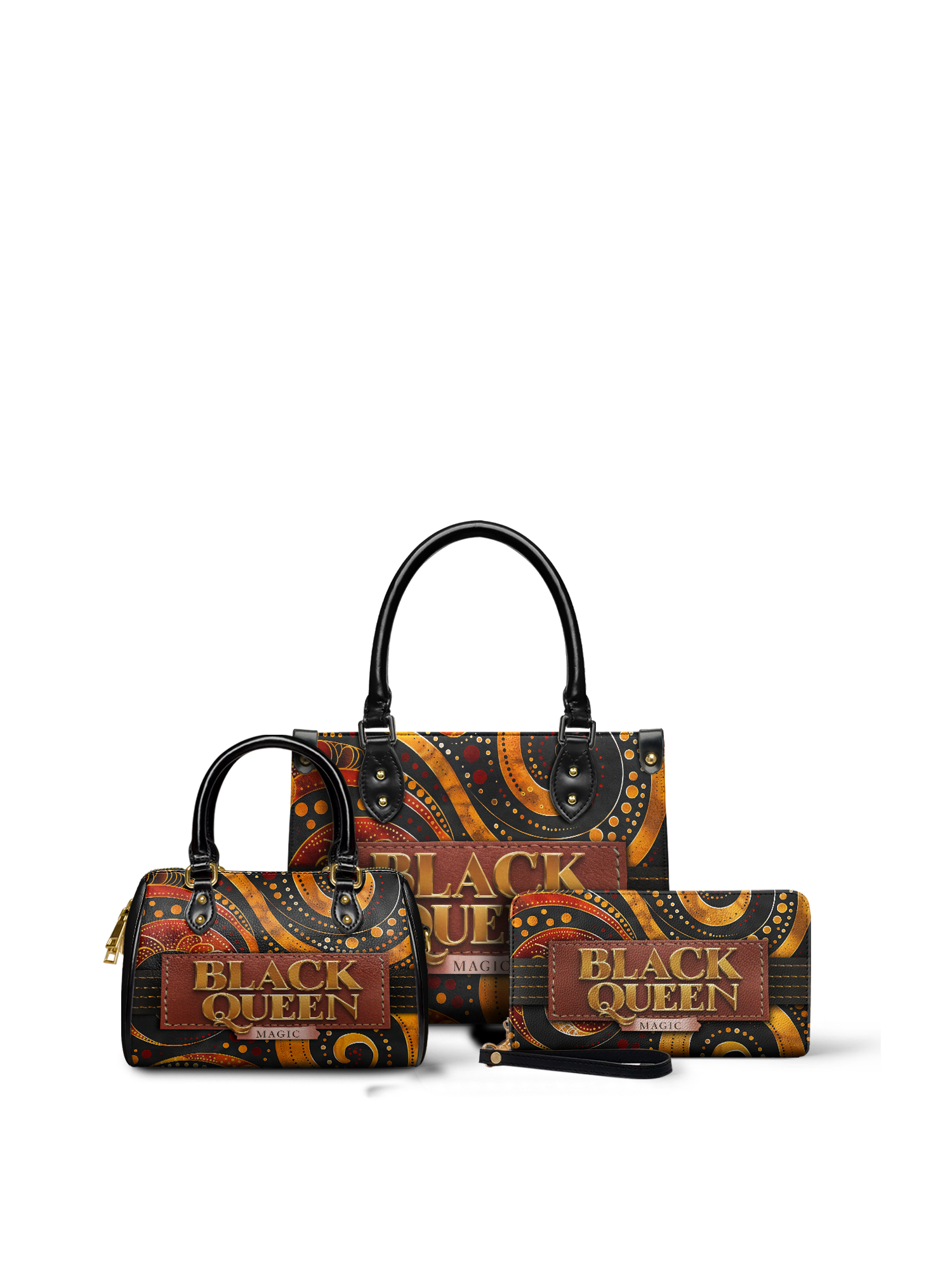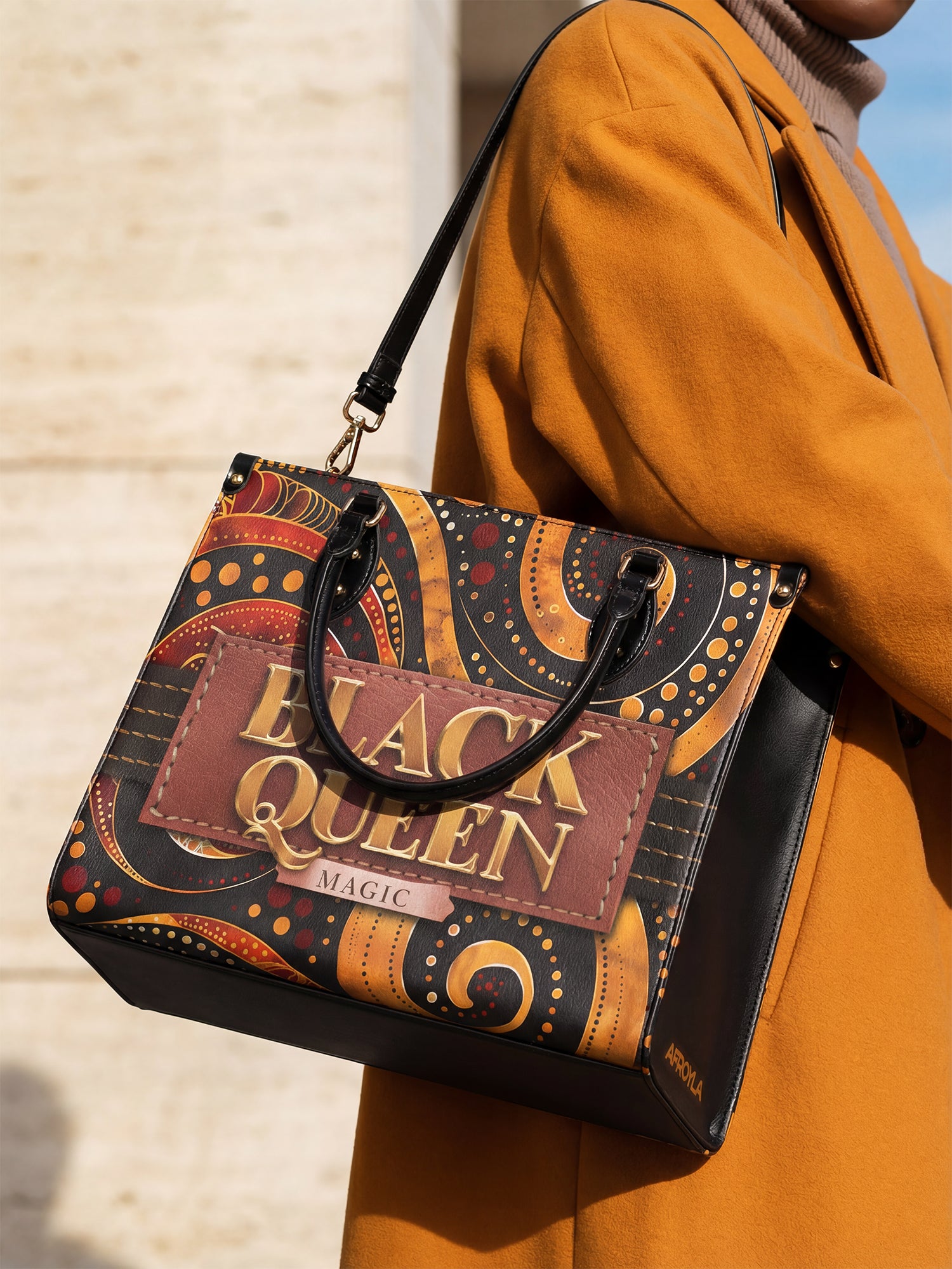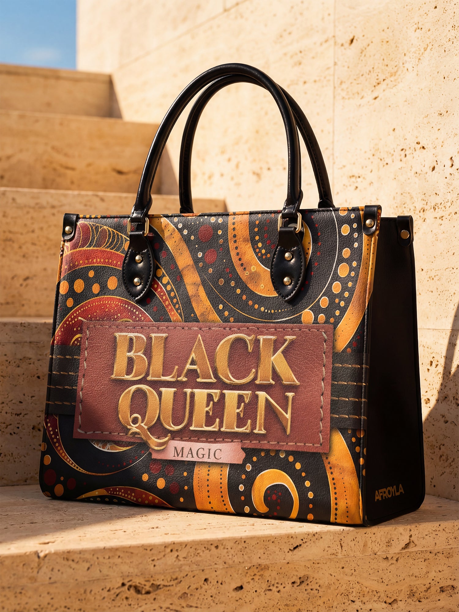 With rich, rhythmic swirls in burnt orange, bold golds, and deep chocolate brown, the Makeda handbag commands attention without saying a word. But when she does speak? Oh, she declares BLACK QUEEN MAGIC loud and proud in luxe golden lettering stitched into a deep terracotta patch.