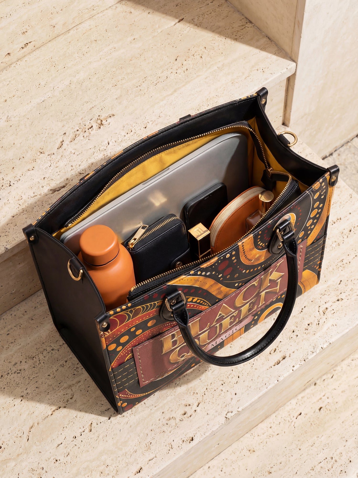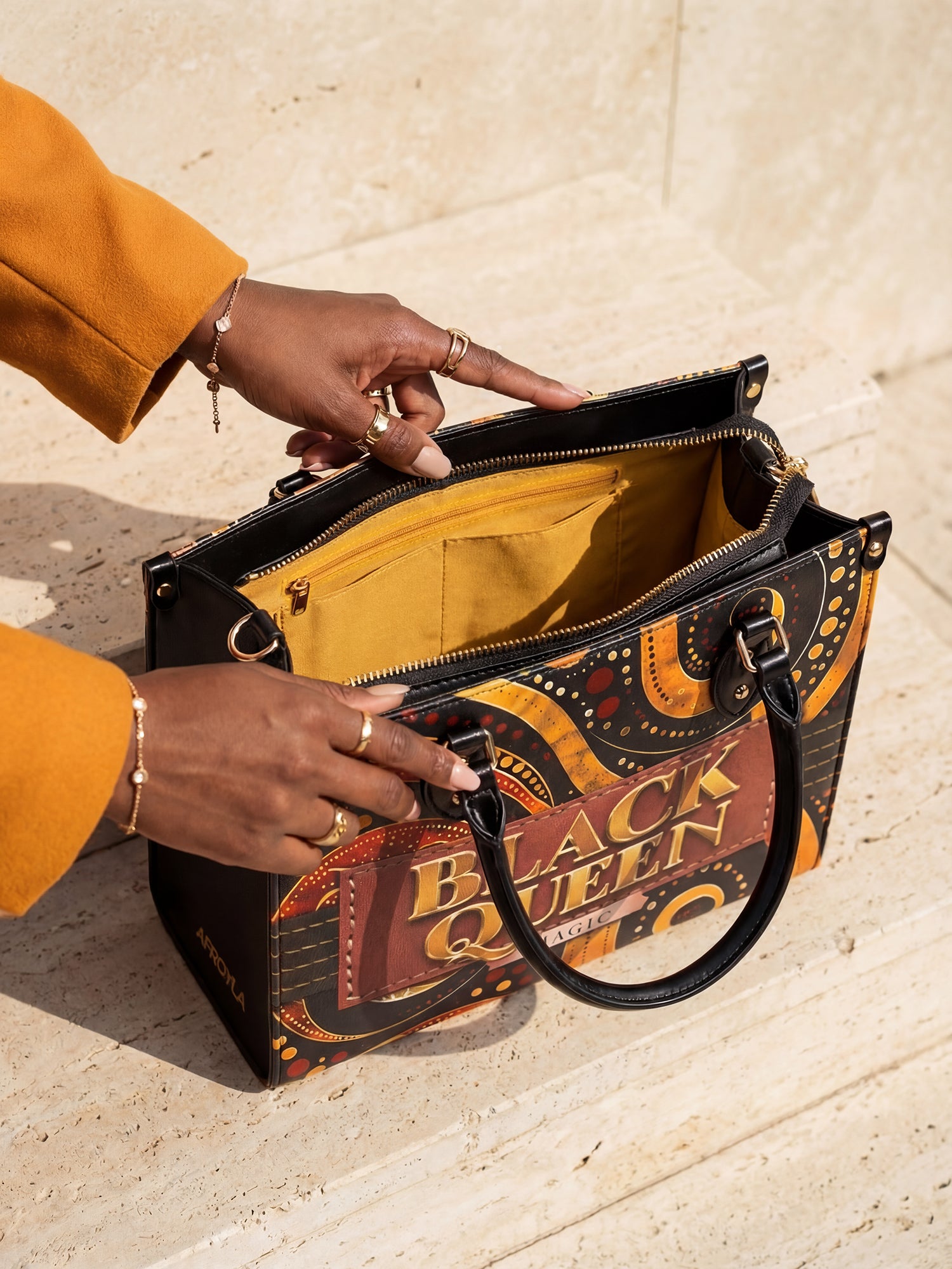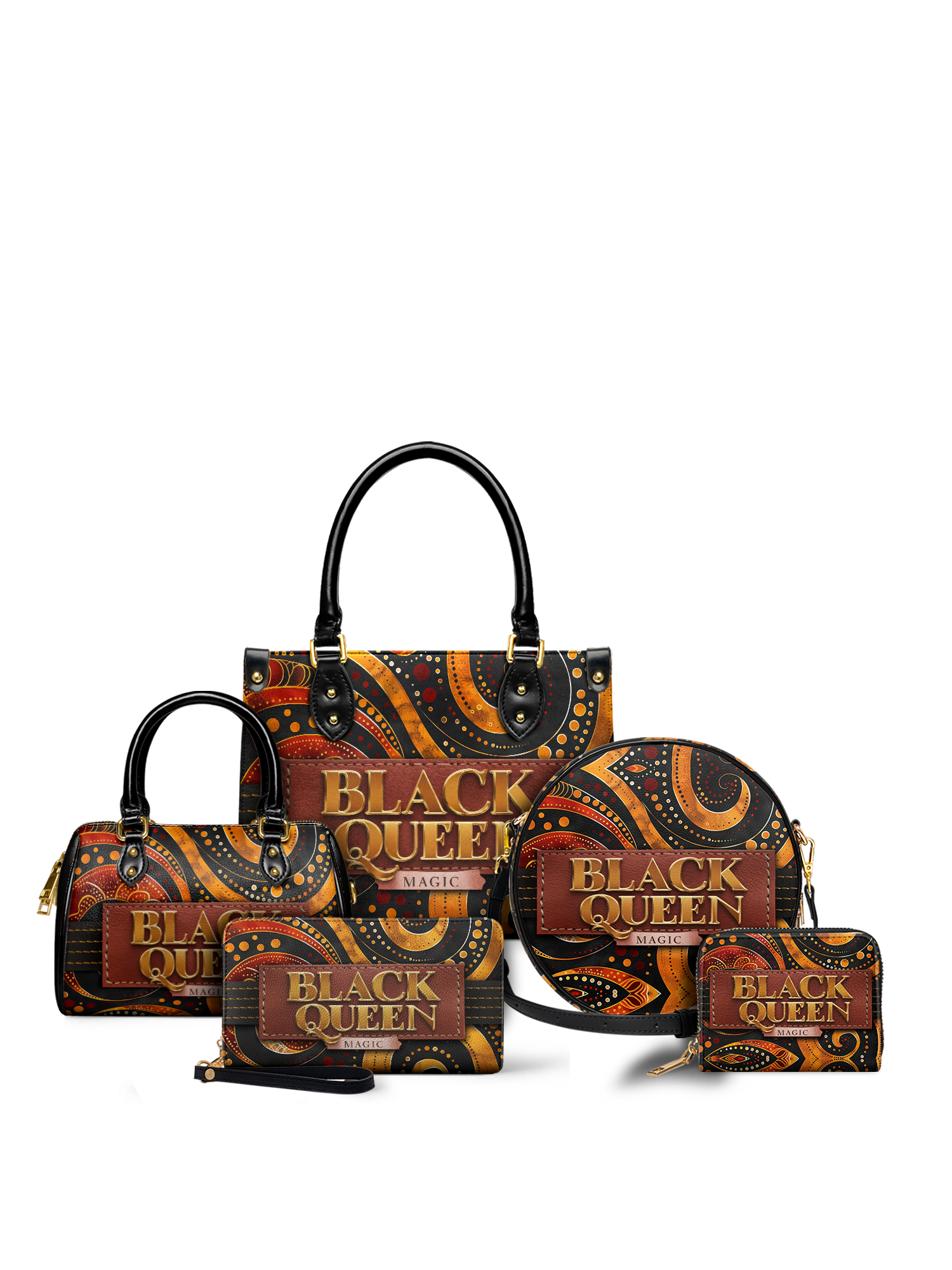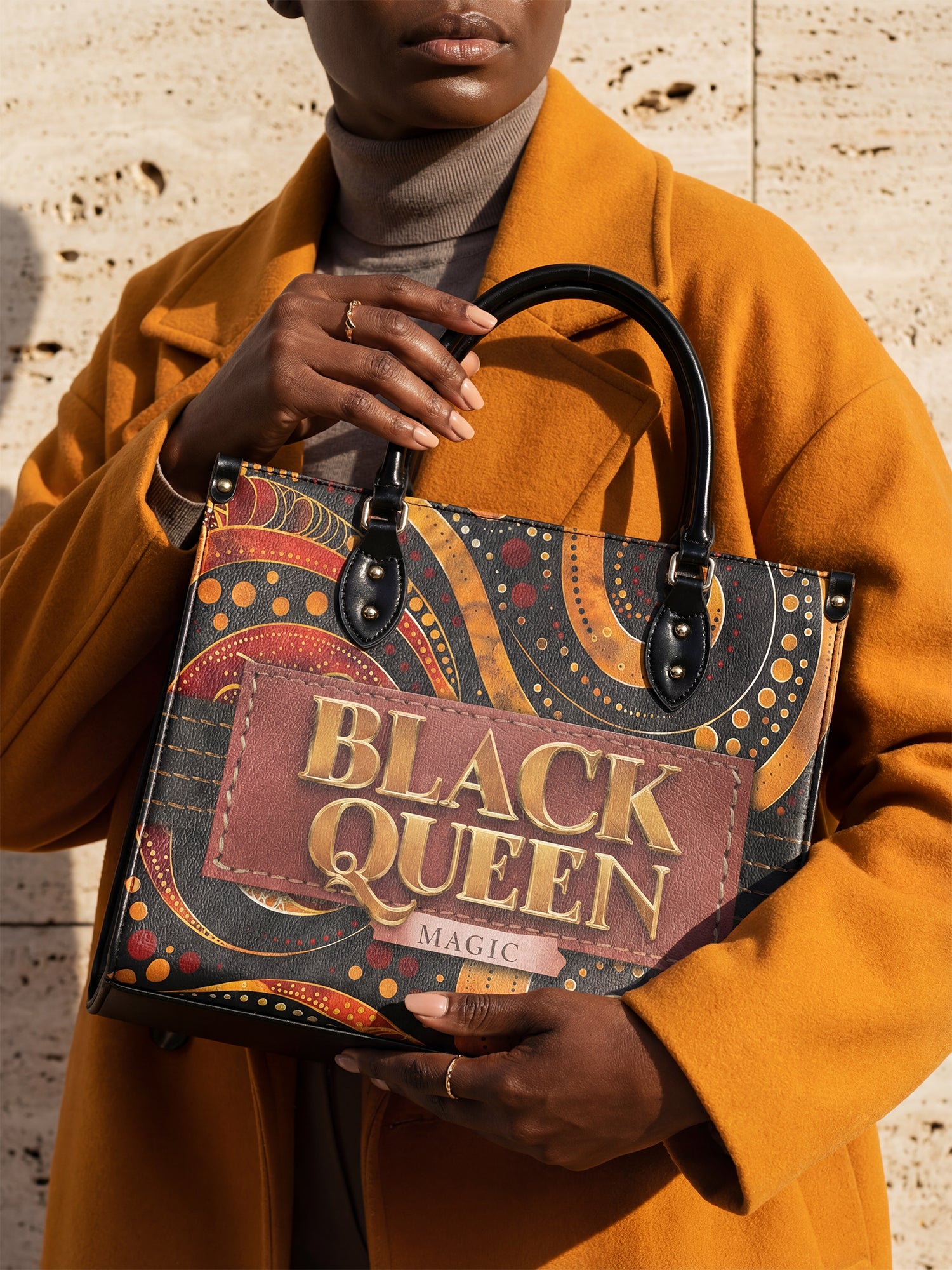 With rich, rhythmic swirls in burnt orange, bold golds, and deep chocolate brown, the Makeda handbag commands attention without saying a word. But when she does speak? Oh, she declares BLACK QUEEN MAGIC loud and proud in luxe golden lettering stitched into a deep terracotta patch.