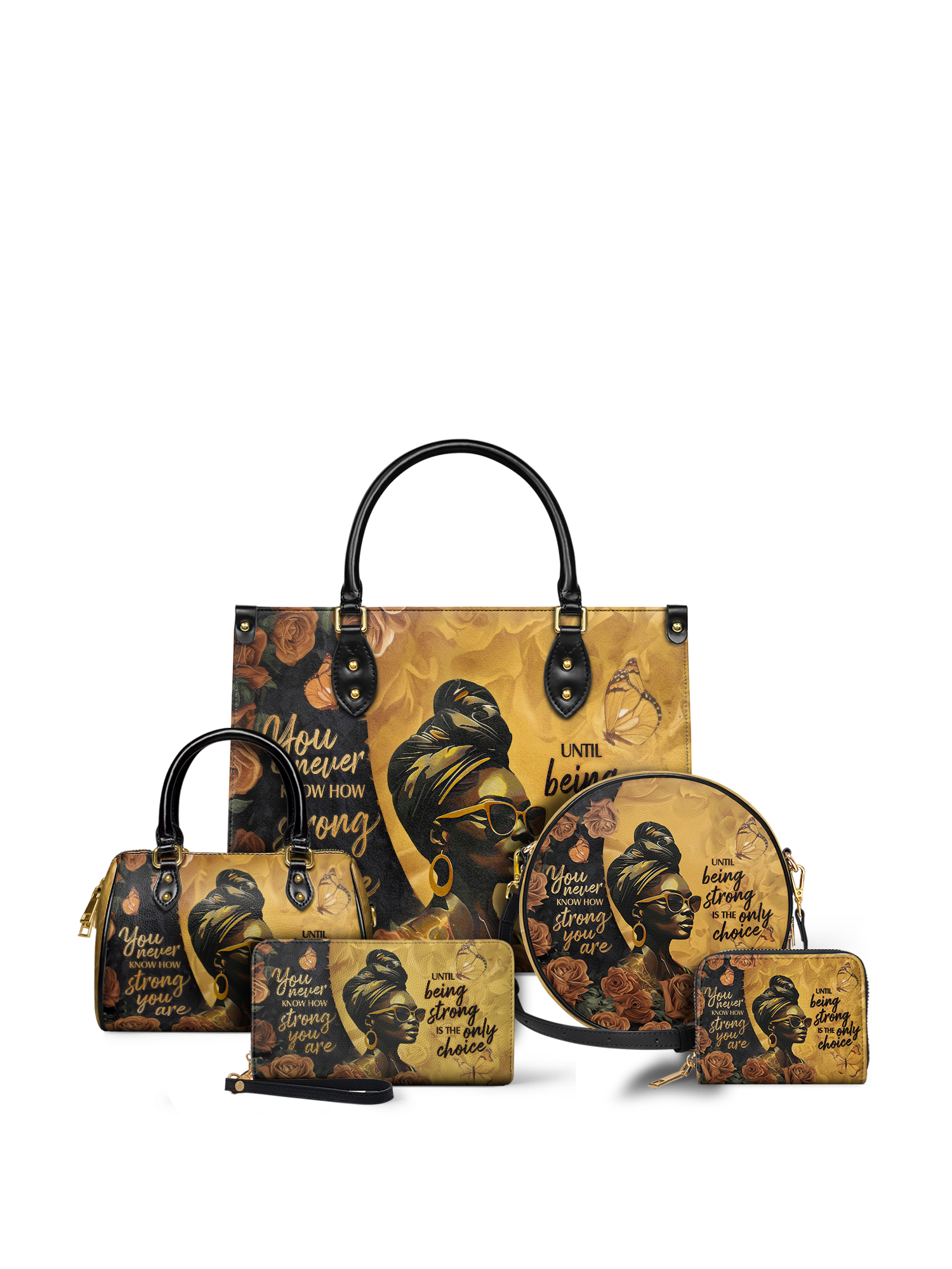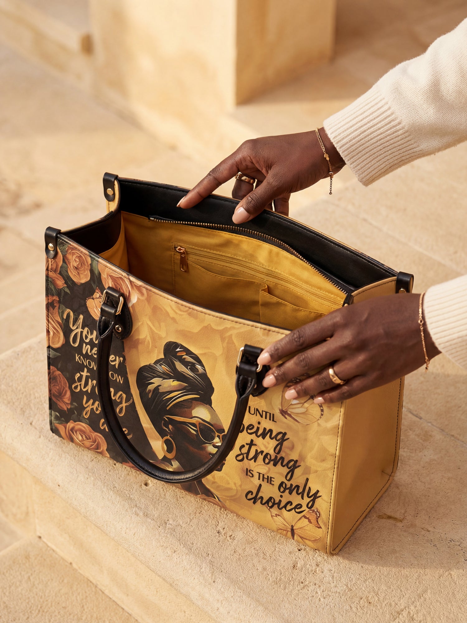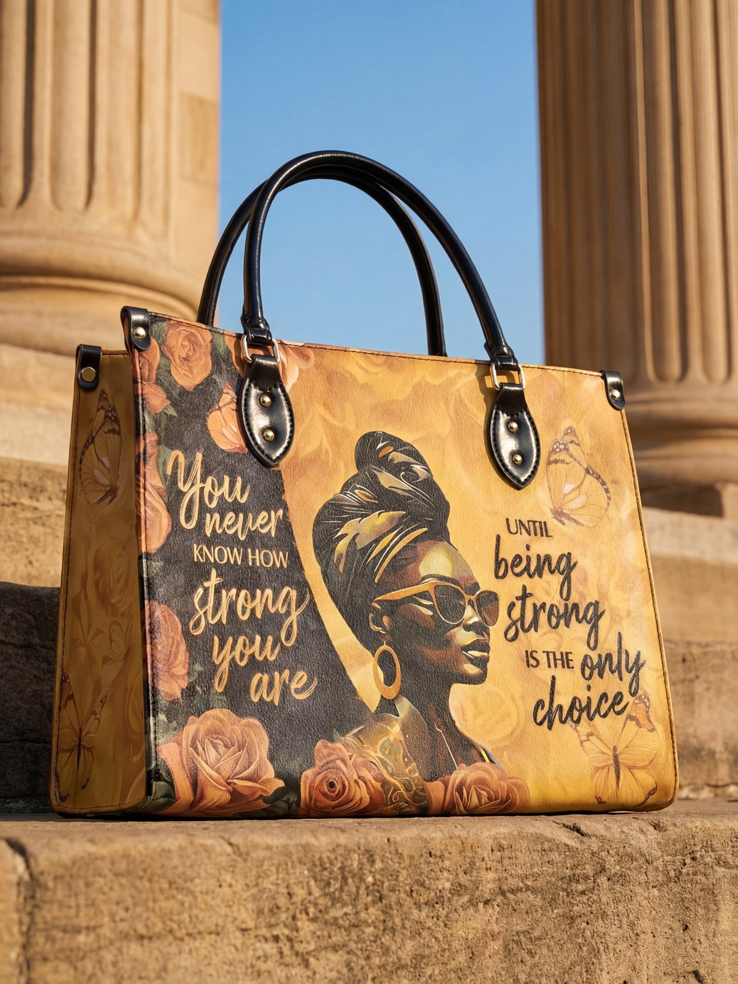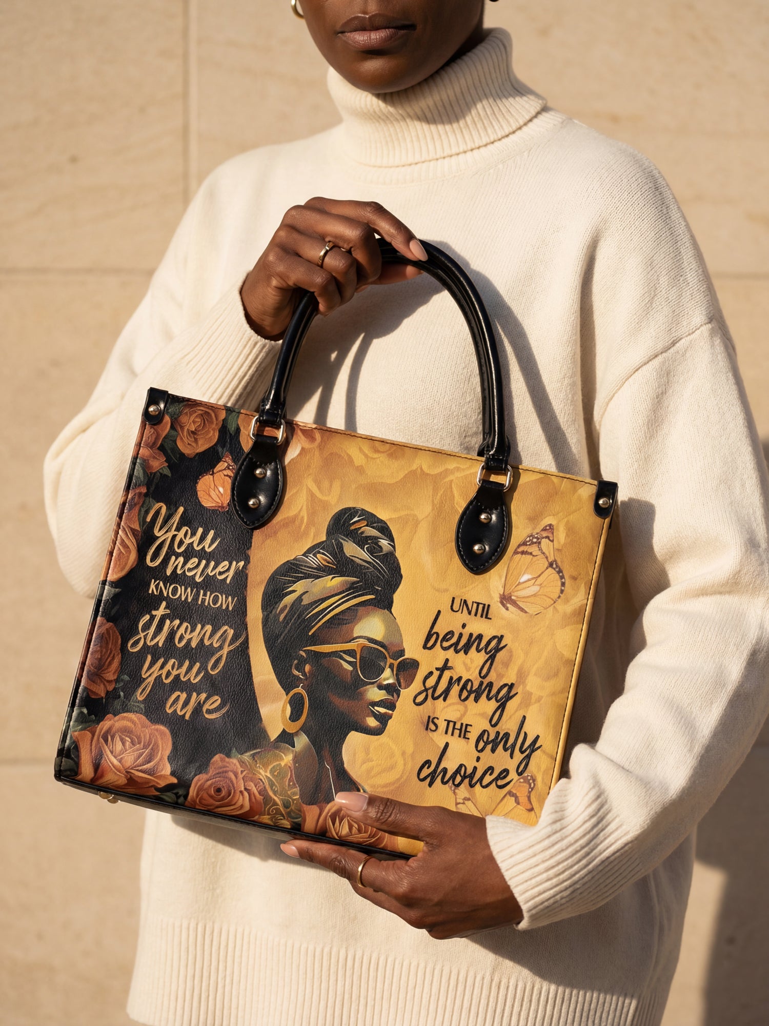 The "Siyanda" Strong Handbag is a tribute to the unshakable strength of Black women. Featuring the powerful quote "You never know how strong you are until being strong is the only choice," this bag is a reminder of resilience, courage, and grace. With rich golden tones and elegant artwork, "Siyanda" is more than a handbag—it’s a statement of power and perseverance. Carry it with pride, because your strength is unmatched.