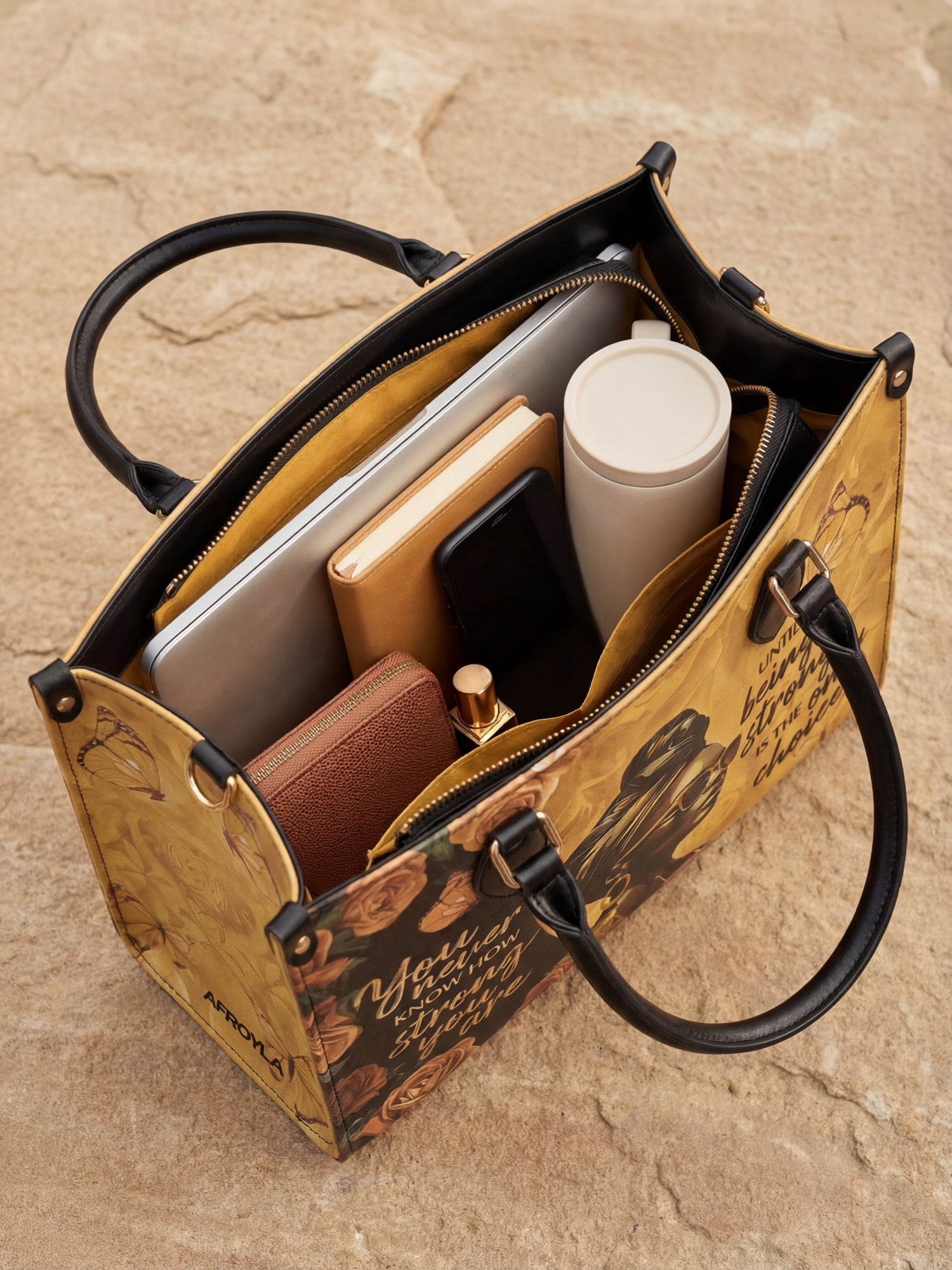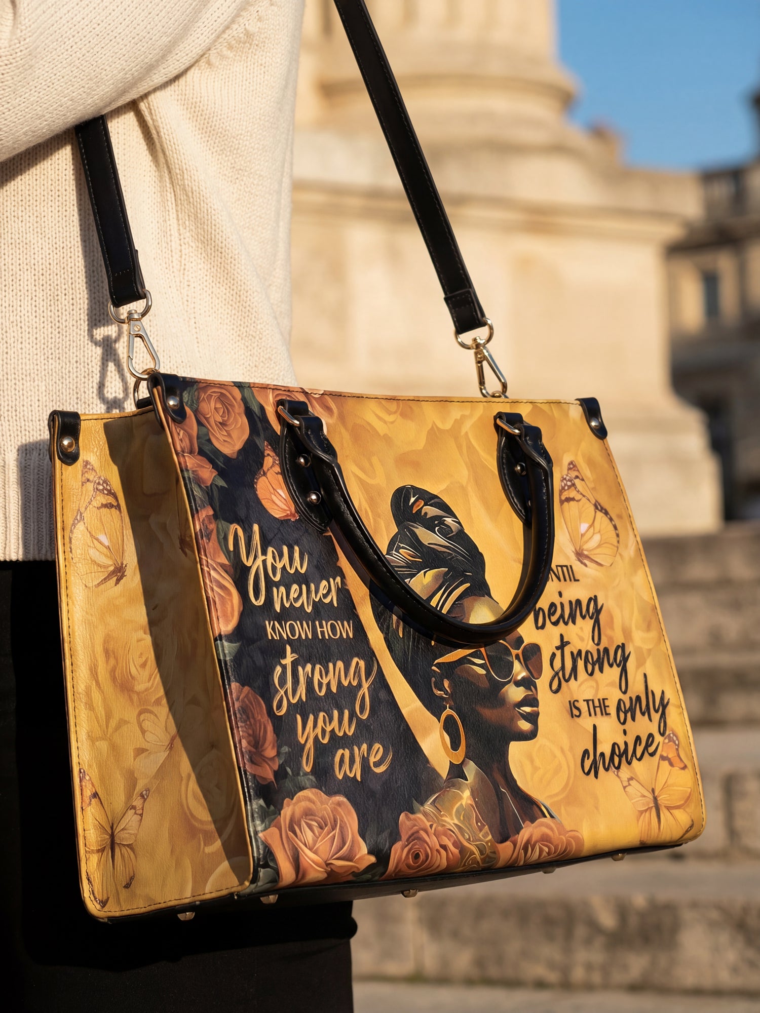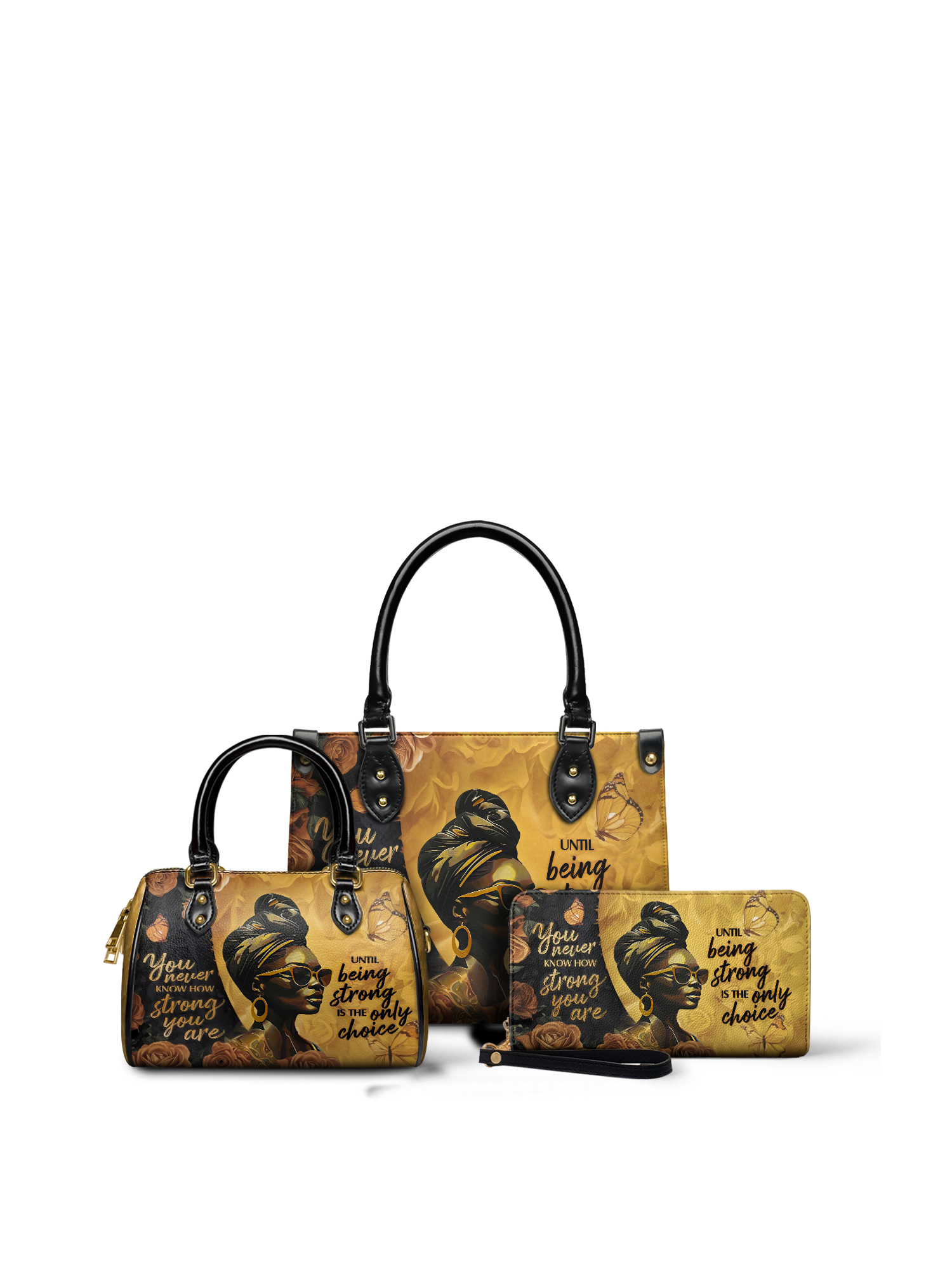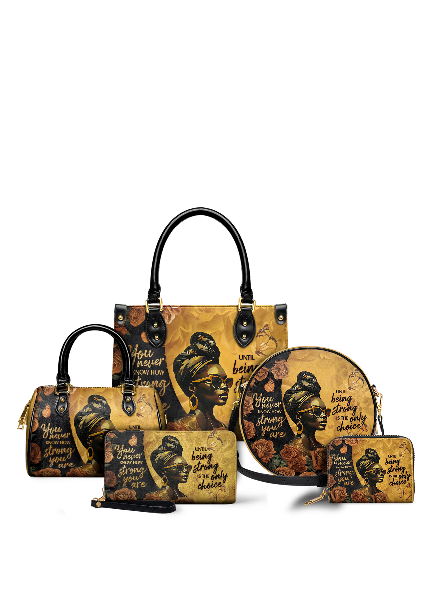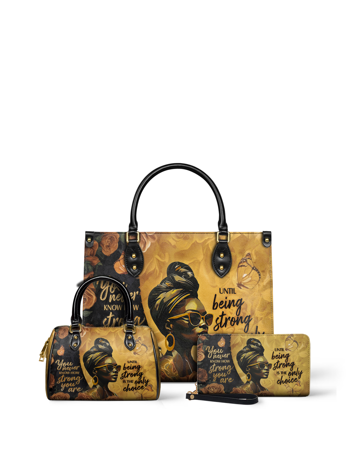 The "Siyanda" Strong Handbag is a tribute to the unshakable strength of Black women. Featuring the powerful quote "You never know how strong you are until being strong is the only choice," this bag is a reminder of resilience, courage, and grace. With rich golden tones and elegant artwork, "Siyanda" is more than a handbag—it’s a statement of power and perseverance. Carry it with pride, because your strength is unmatched.