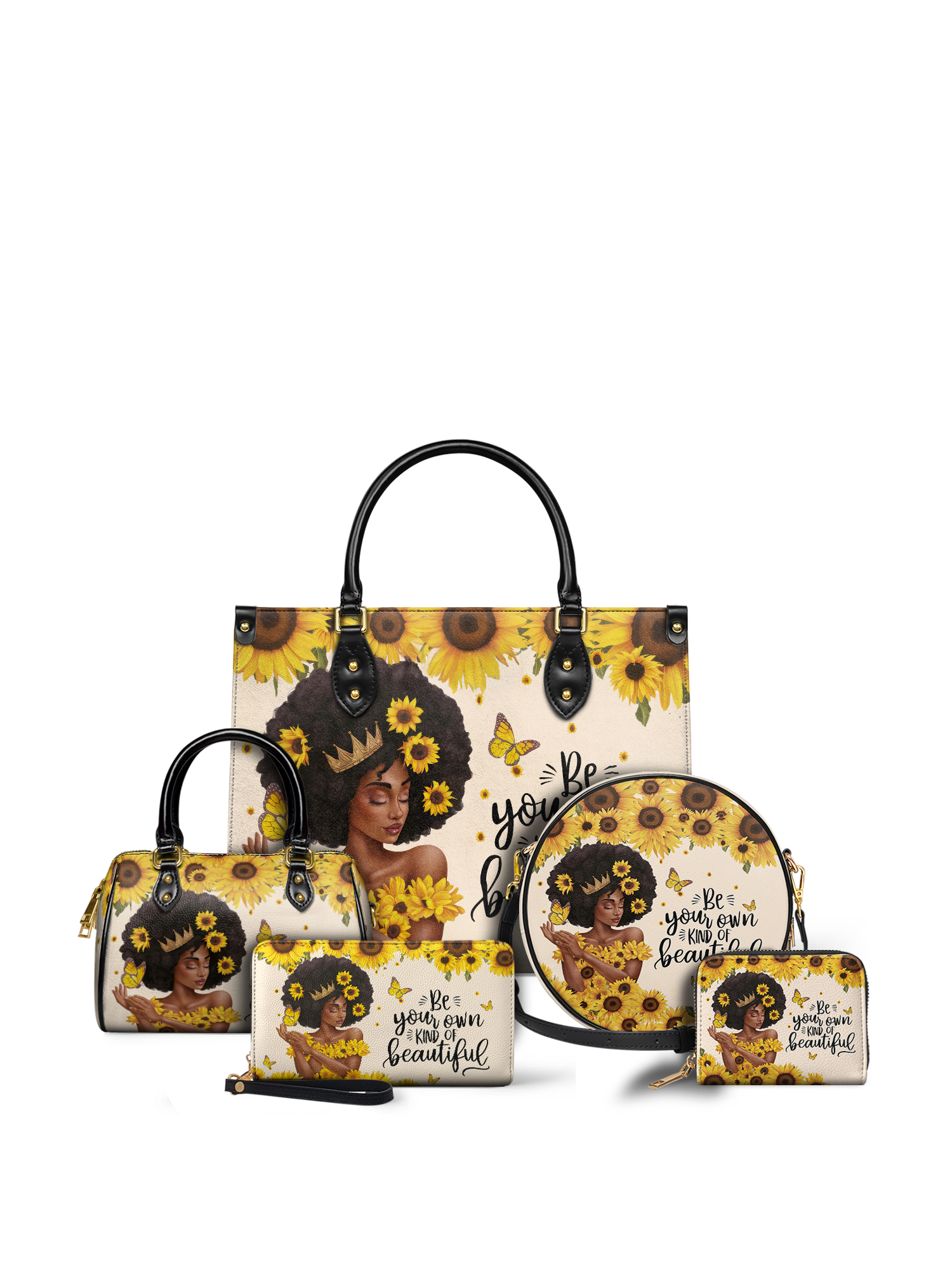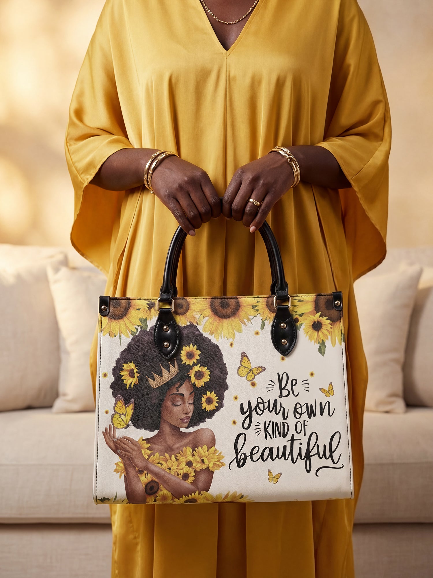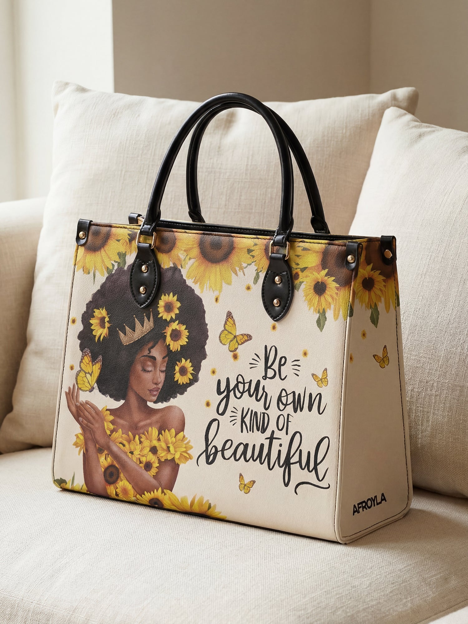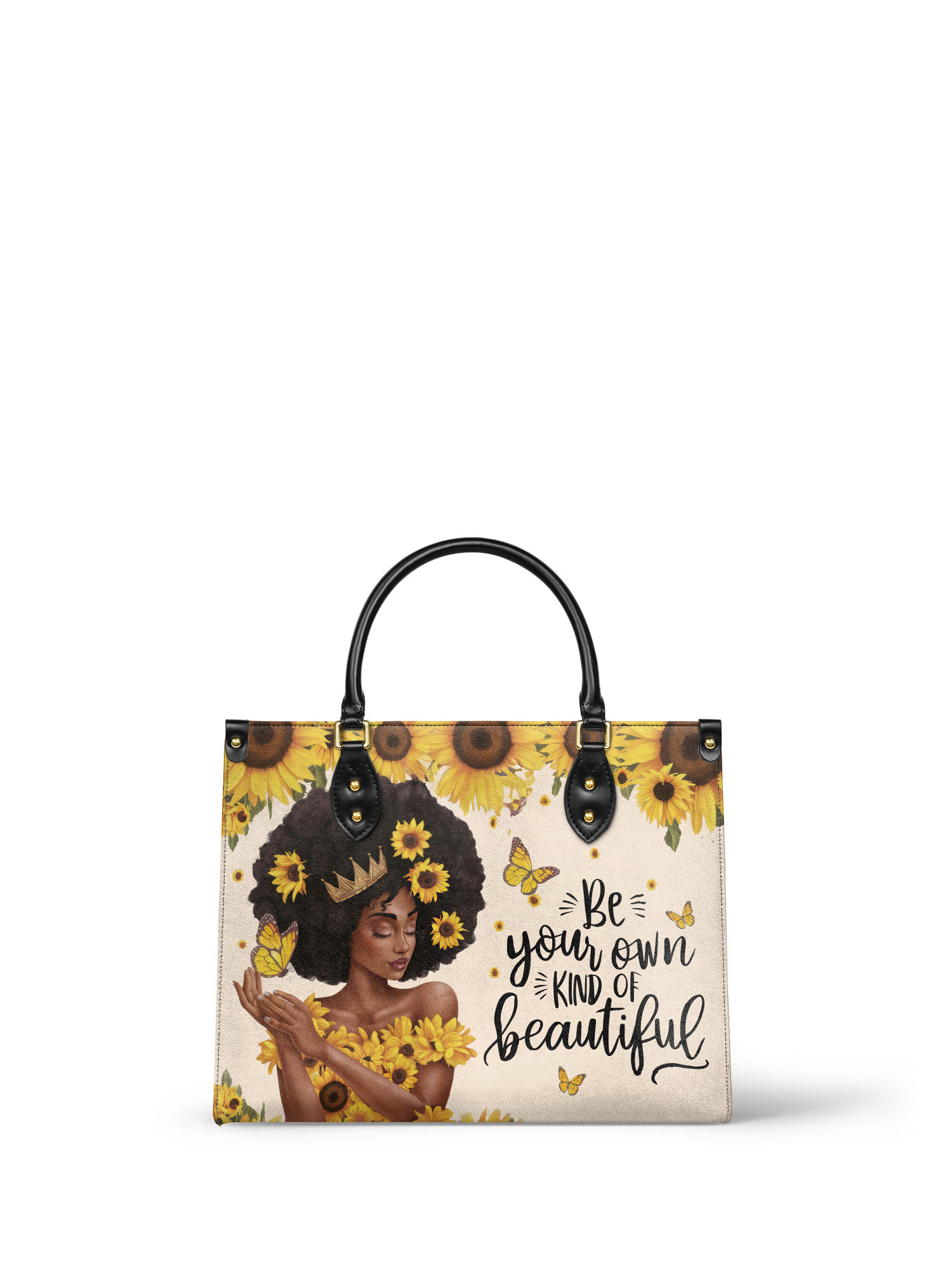 The Zuriya Handbag, inspired by the Swahili name Zuri, meaning "beautiful", is a celebration of Black women’s unique beauty and self-love. Featuring the empowering quote "Be your own kind of beautiful," this bag reminds you to embrace your radiance with confidence. Decorated with sunflowers, butterflies, and a regal queen, Zuriya is more than a handbag—it’s a statement of self-worth, pride, and the beauty of being unapologetically you. Carry it and shine!