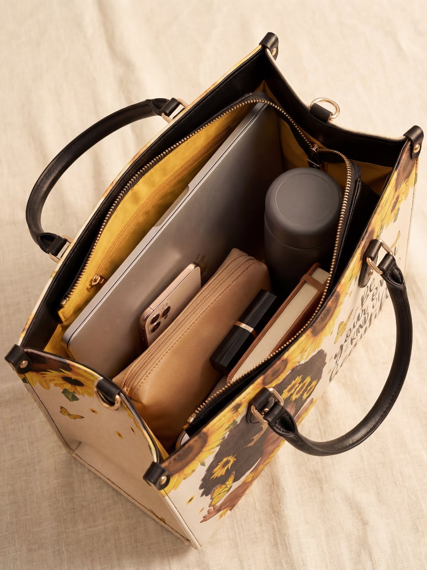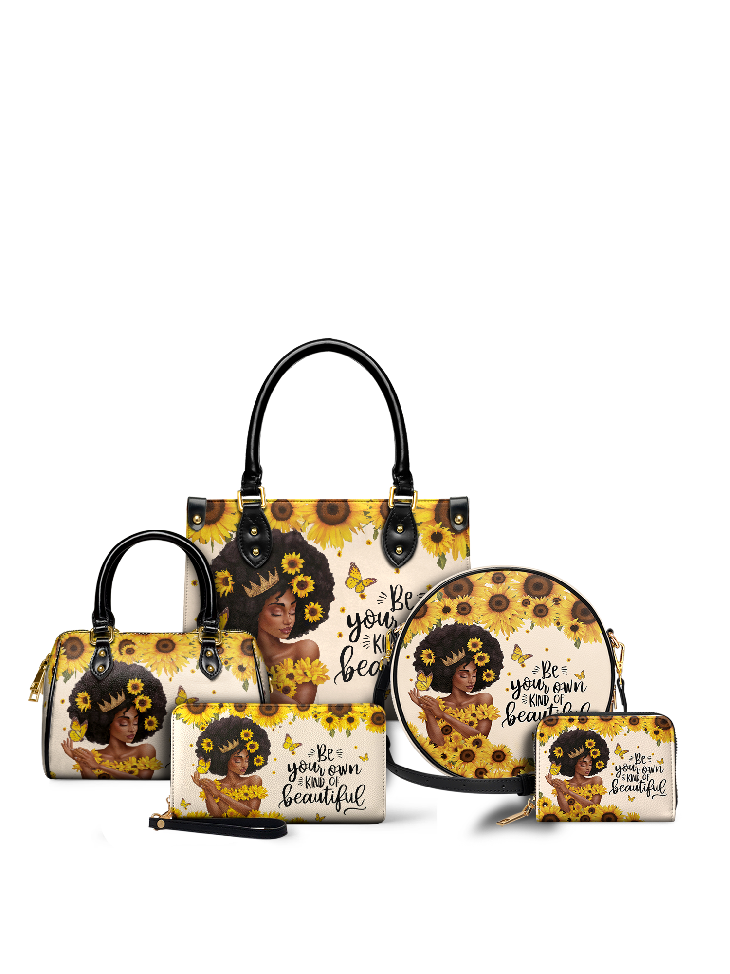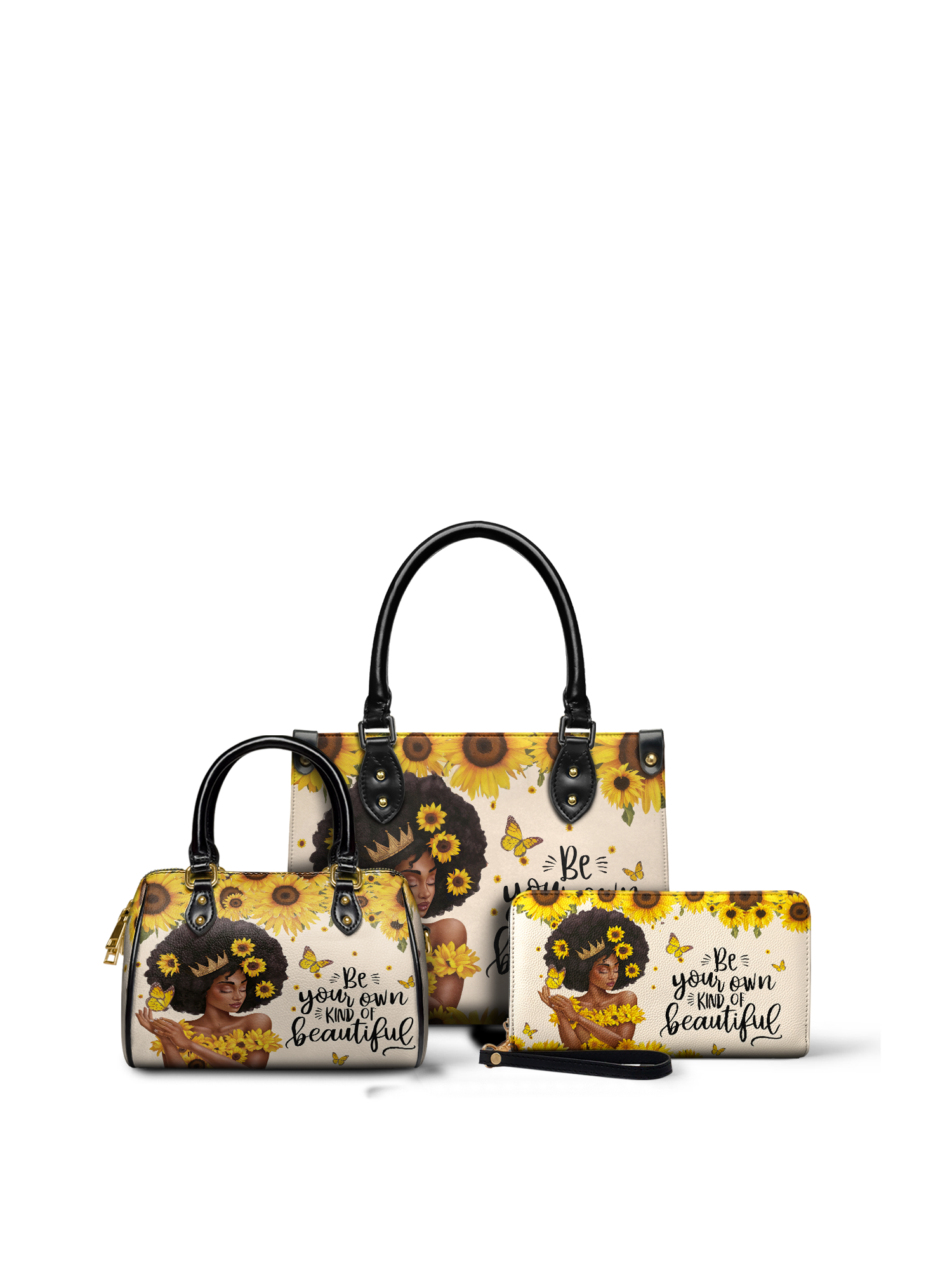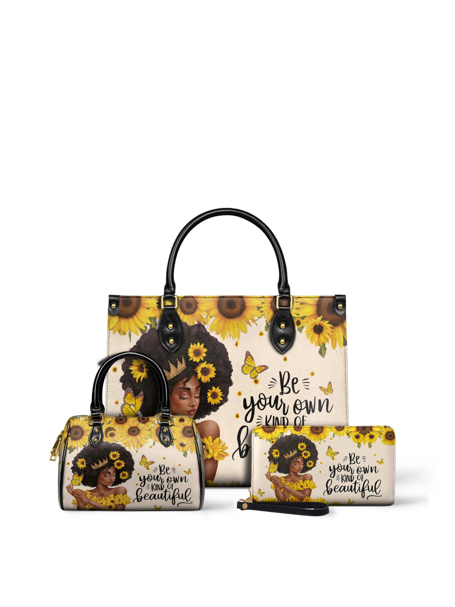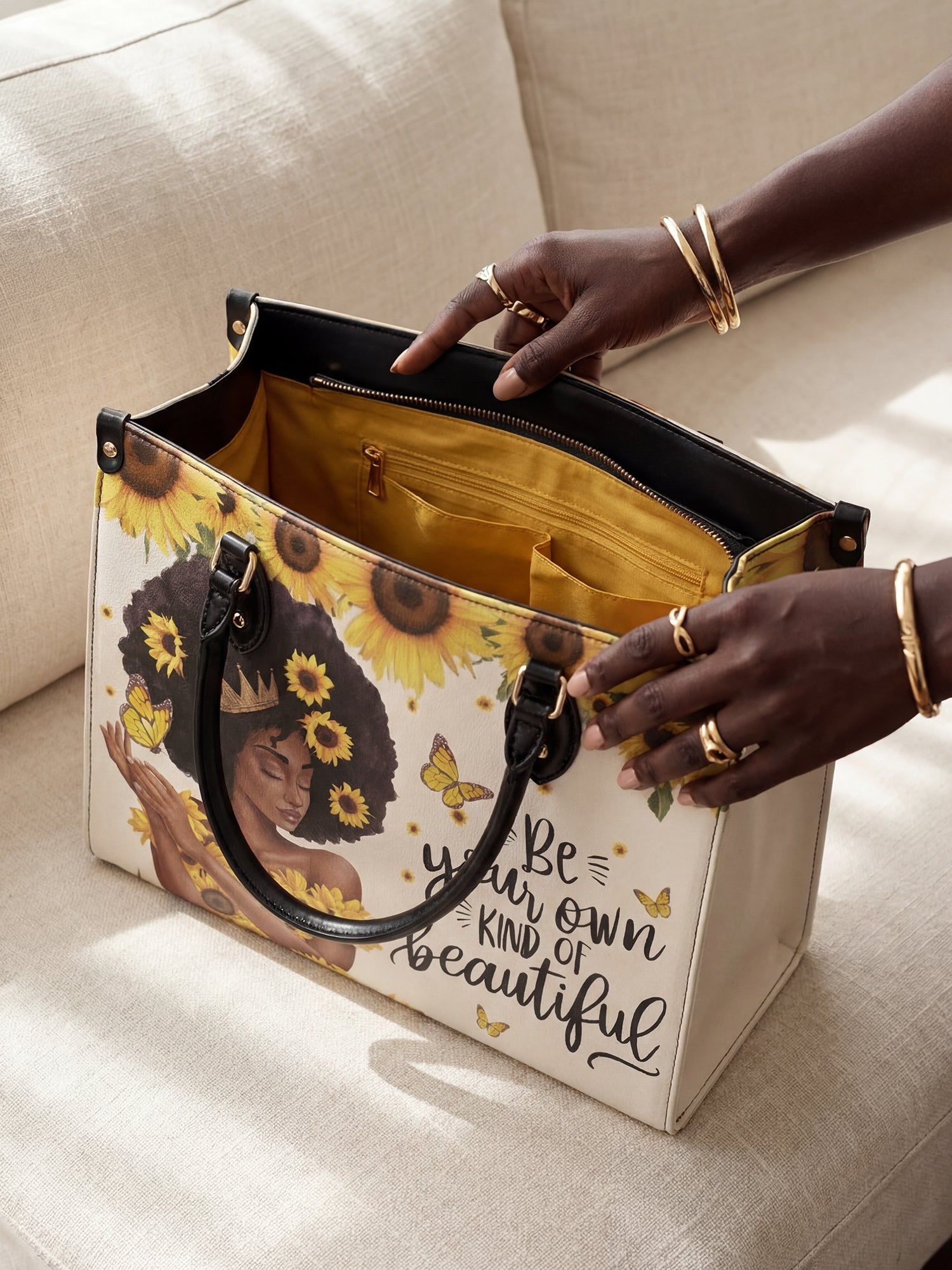 The Zuriya Handbag, inspired by the Swahili name Zuri, meaning "beautiful", is a celebration of Black women’s unique beauty and self-love. Featuring the empowering quote "Be your own kind of beautiful," this bag reminds you to embrace your radiance with confidence. Decorated with sunflowers, butterflies, and a regal queen, Zuriya is more than a handbag—it’s a statement of self-worth, pride, and the beauty of being unapologetically you. Carry it and shine!